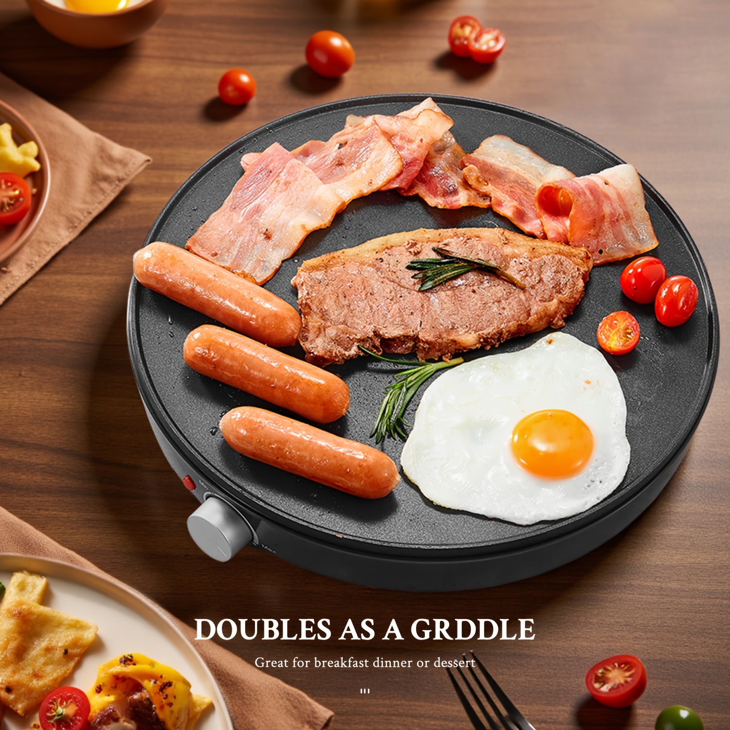 Versatility: Easily make crepes, pancakes, omelets, hash browns, and more with this multi-functional electric crepe maker, which also doubles as a griddle for versatile cooking day or night.