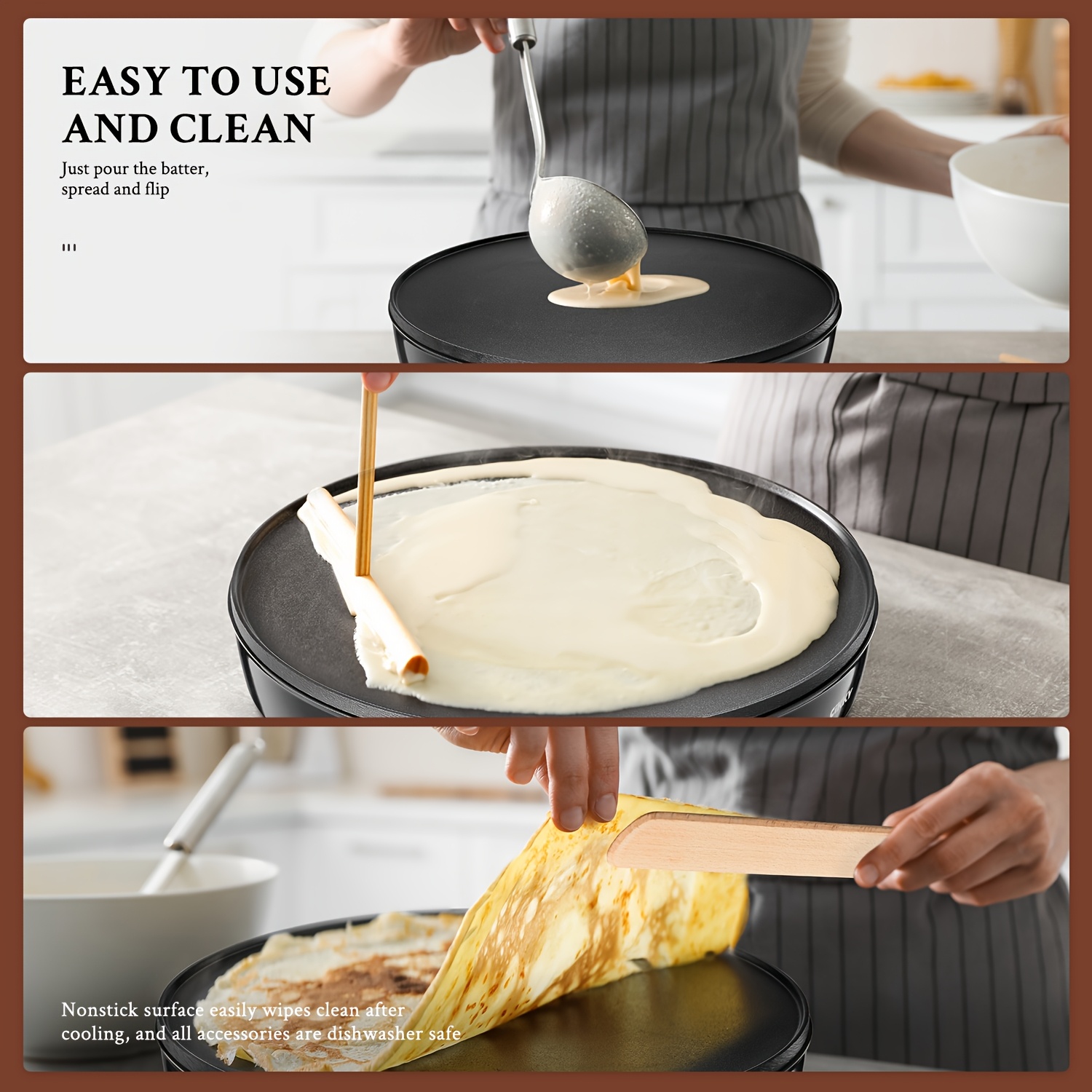 Compact, Quick & Convenient: Designed without a heavy base, this crepe maker fits on any countertop, making it easy to prepare breakfast anywhere. The high-quality, food-grade aluminum cooking plate ensures safe and reliable long-term use.