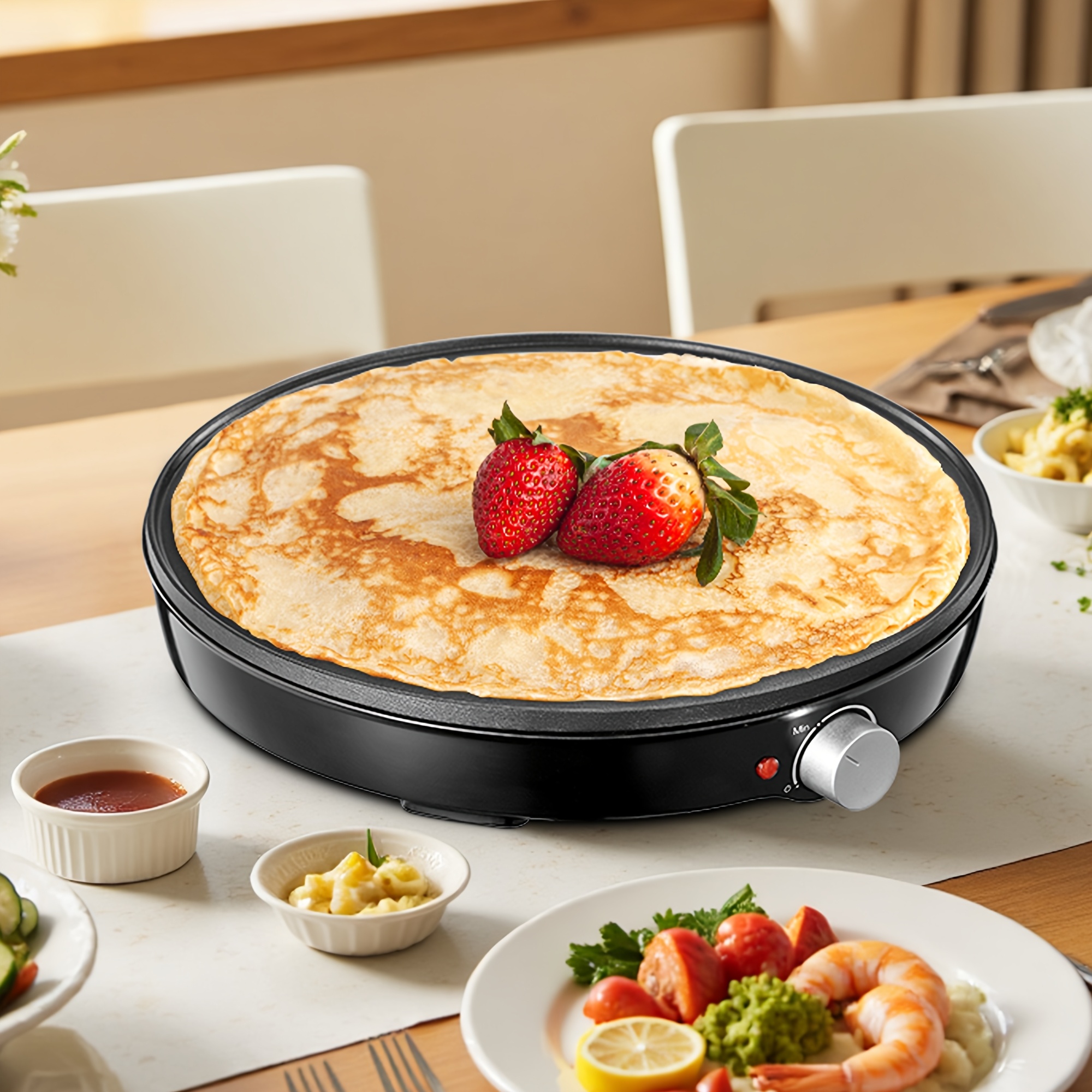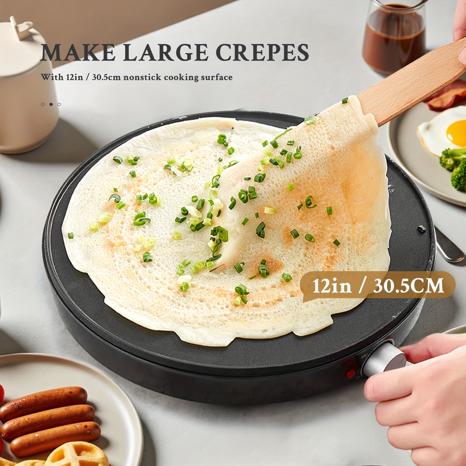 Product description Electric Crepe Maker & Pancake Griddle with Precise Temperature Control, Nonstick Surfa, Includes Spatula & Batter Spreader for Eggs, Omelets & Quesadillas