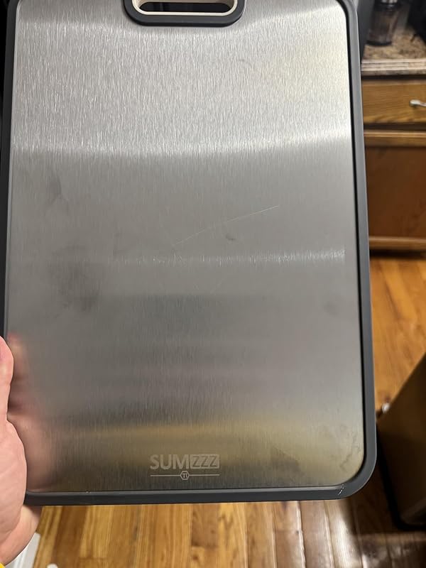 I’ve been really impressed with this titanium cutting board. It feels incredibly sturdy—no flexing or sliding around when I’m chopping tougher foods—and the thickness gives it a solid, high-quality feel without being too heavy. One of my favorite things is how stain-resistant it is: no discoloration from tomatoes, turmeric, or raw meat, and it doesn’t hold onto smells at all. Cleanup is super easy too—just rinse and wipe, and it looks brand new. The size is great for everyday meal prep without taking over the counter. It does have a slightly louder sound when cutting compared to wood, and you’ll want to keep your knives sharp, but overall it feels durable, hygienic, and built to last. Definitely feels like a long-term upgrade over plastic or wood boards.