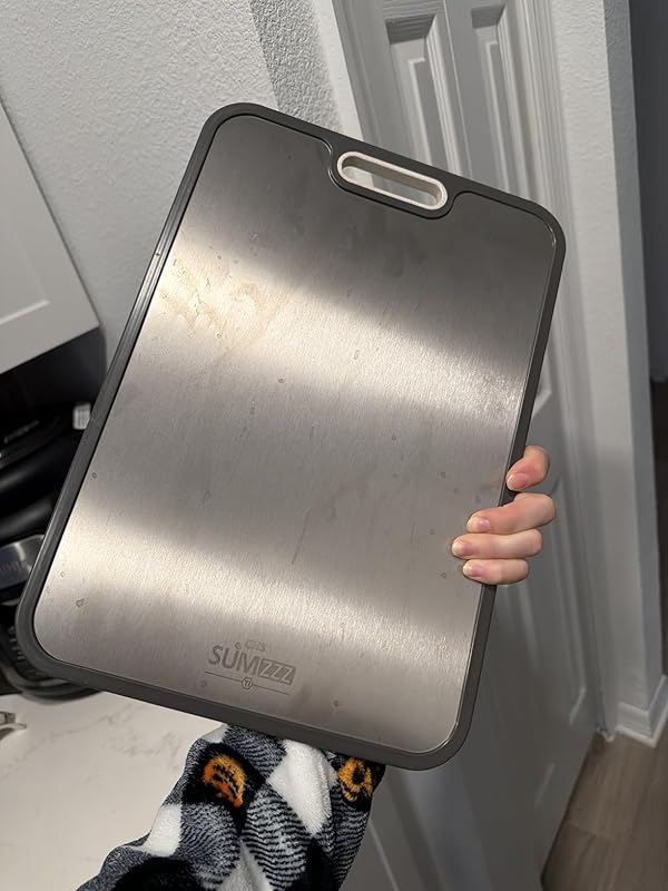 I am beyond impressed with this titanium cutting board. I’ve been looking for a safer, more hygienic alternative to traditional wood and plastic boards, and this one exceeded my expectations.First of all, the quality is outstanding. The titanium side feels incredibly sturdy and smooth, yet it doesn’t feel flimsy or cheap at all. It’s solid without being too heavy. I love that it’s double-sided — I use the titanium side for meat and fish, and the PP side for fruits, vegetables, and bread. It makes food prep feel cleaner and more organized.One of my favorite things is how easy it is to clean. It rinses off quickly, doesn’t absorb odors, and doesn’t stain like plastic boards do. No lingering smells from garlic or onions! That alone makes it worth it. I also appreciate that it feels more sanitary compared to wood boards that can trap moisture and bacteria.The size (16” x 11”) is perfect — large enough for real meal prep but still easy to store. The non-slip edges keep it stable on the counter, which makes chopping feel safe and secure.It also looks very sleek and modern in the kitchen. The minimalist design is a bonus.If you’re trying to upgrade your kitchen tools to something more durable, easy to maintain, and long-lasting, this is a fantastic choice. Highly recommend — I would definitely purchase again!