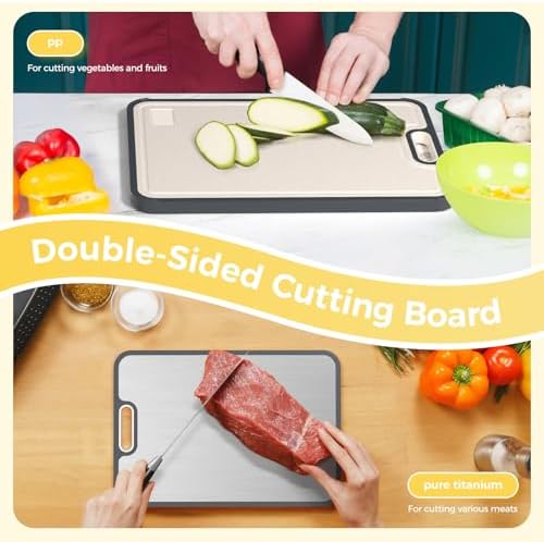 【2 IN 1 Cutting Board 】Cutting board is a versatile 2 in 1 kitchen tool, with one side made of food-grade 99.9%Pure Titanium for cutting raw and cooked meat, and the other side made of PP material for cutting vegetables and fruit.
